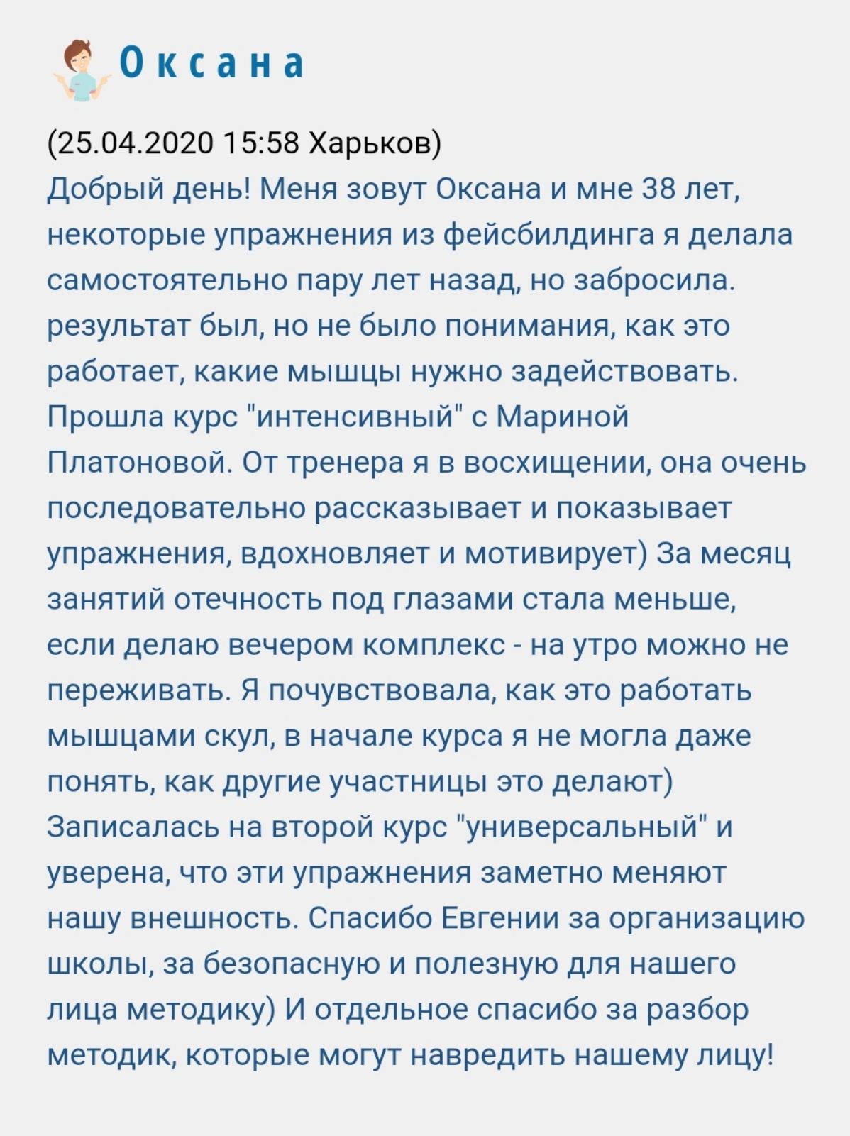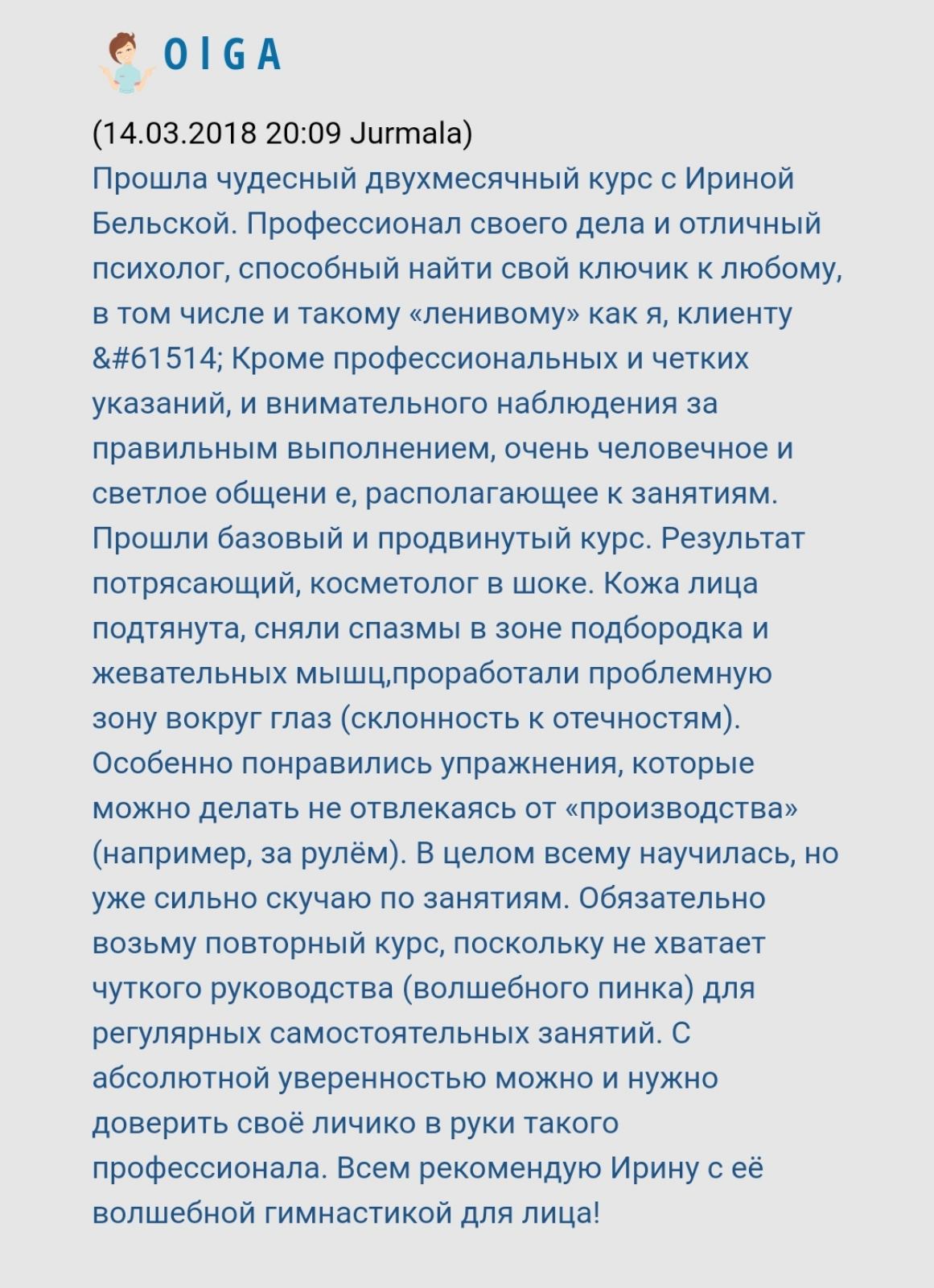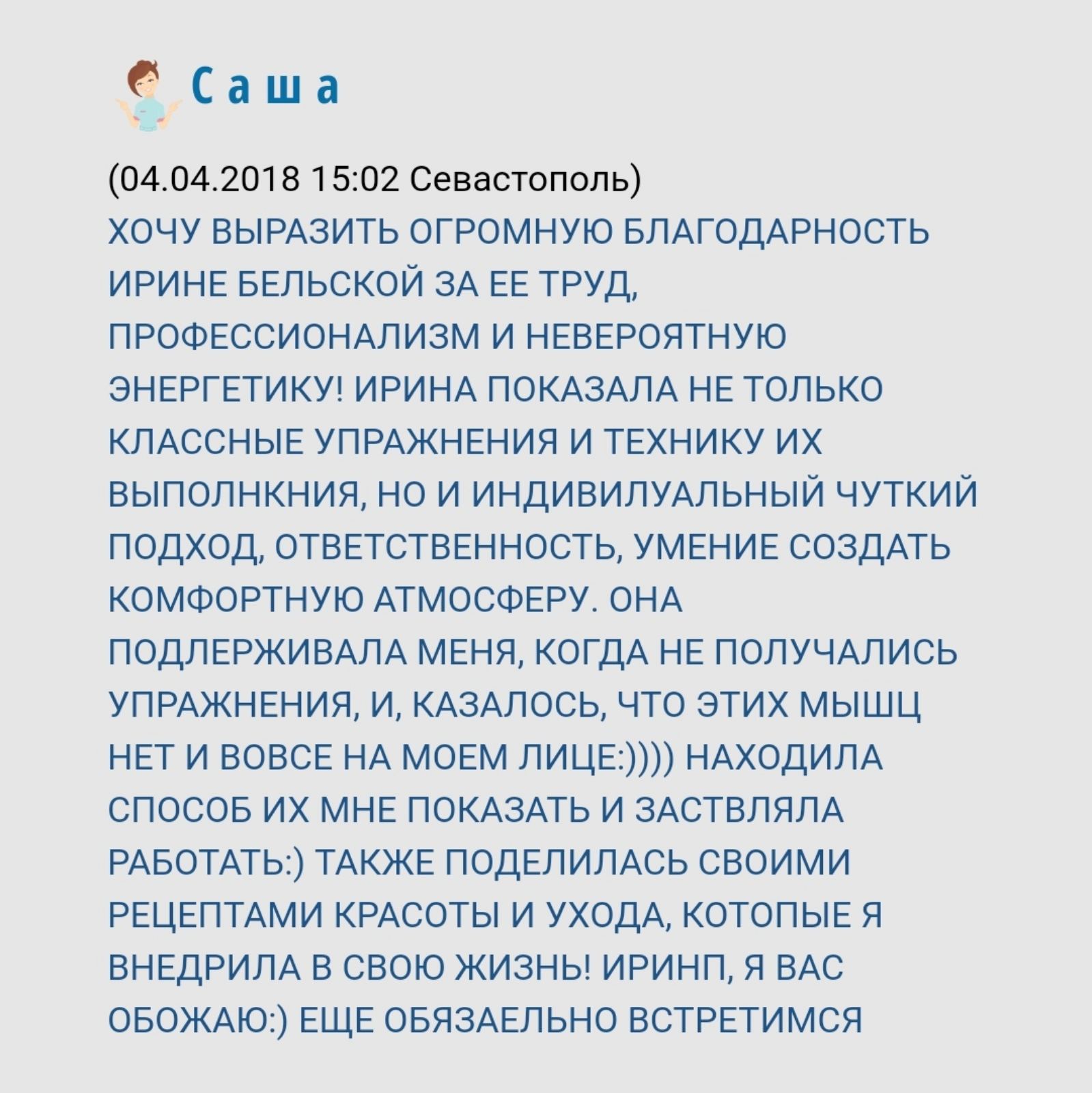Привет! Я Ирина Бельская, топ-тренер нашей школы. В 2013 году, когда мне было 34 года, я изучила методику нашей школы «для себя» и, вдохновившись собственным результатом, с 2014 года я помогаю другим стать моложе и прекрасней) Каждый день я провожу 7-8 занятий. Мои клиенты – это девушки и парни со всего мира, благо современное качество связи плюс многолетний опыт позволяют мне отследить все мышцы лица и шеи. Я даже вижу, когда вы напрягаете затылок!))