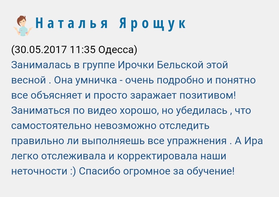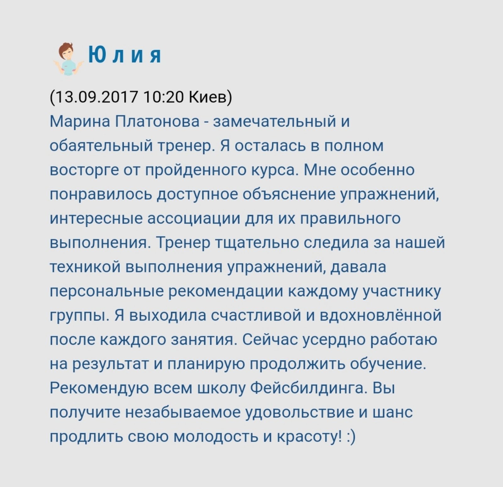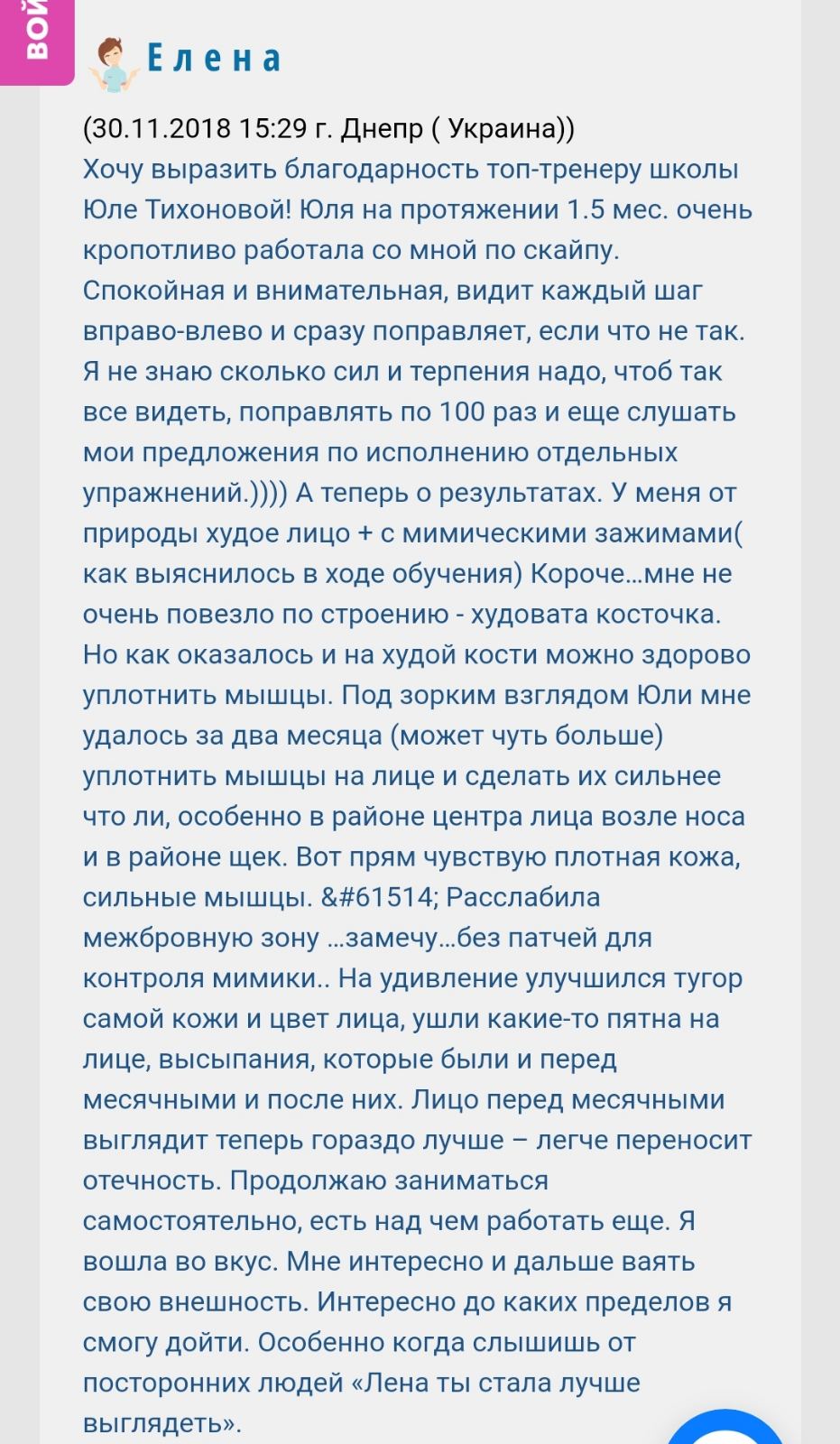 Привет! Я Ирина Бельская, топ-тренер нашей школы. В 2013 году, когда мне было 34 года, я изучила методику нашей школы «для себя» и, вдохновившись собственным результатом, с 2014 года я помогаю другим стать моложе и прекрасней) Каждый день я провожу 7-8 занятий. Мои клиенты – это девушки и парни со всего мира, благо современное качество связи плюс многолетний опыт позволяют мне отследить все мышцы лица и шеи. Я даже вижу, когда вы напрягаете затылок!))