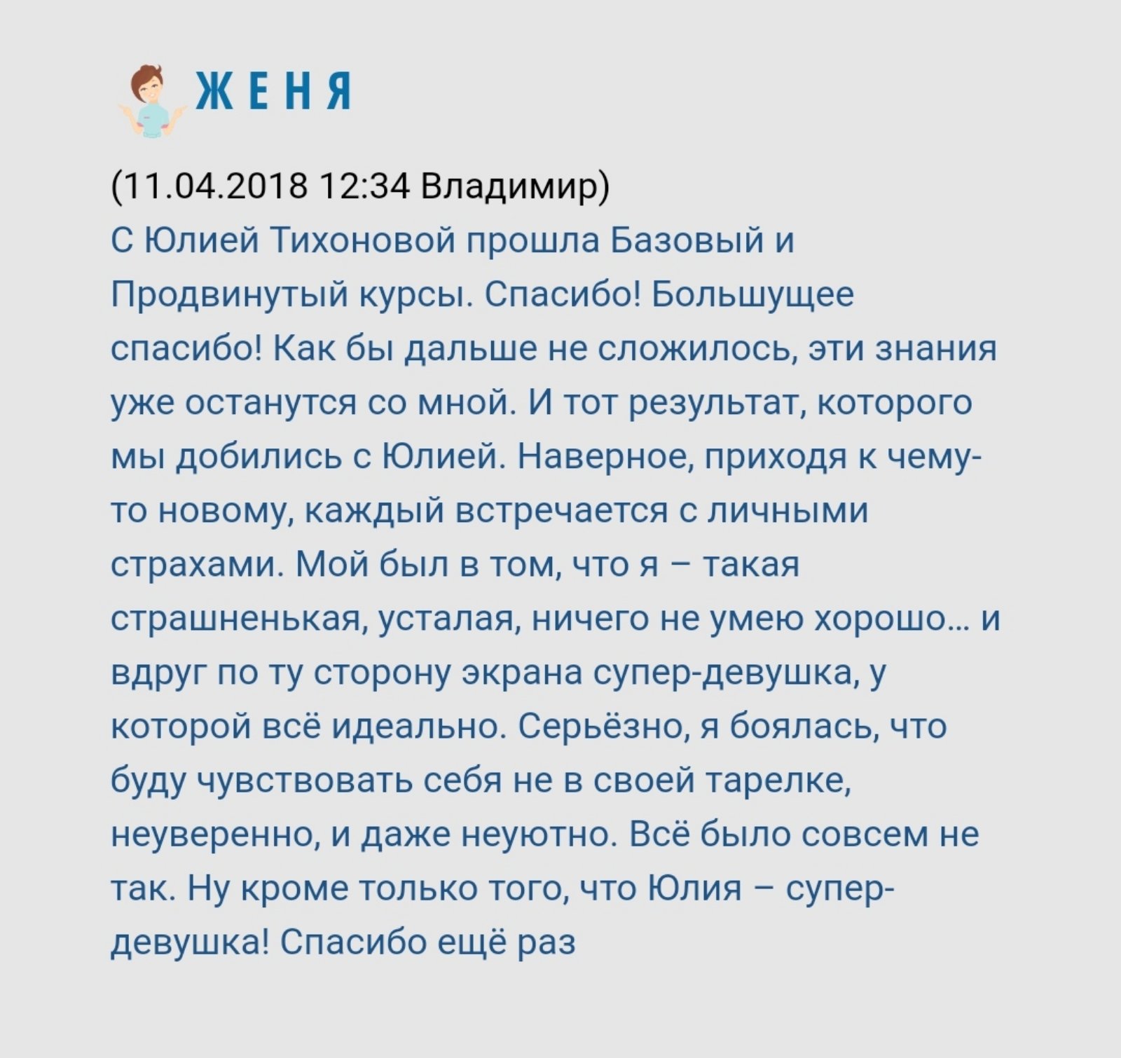 Привет, Я Юлия Тихонова, работаю тренером 5 лет и около 2-х - веду тренерское обучение. Также, я являюсь куратором тренерского клуба.